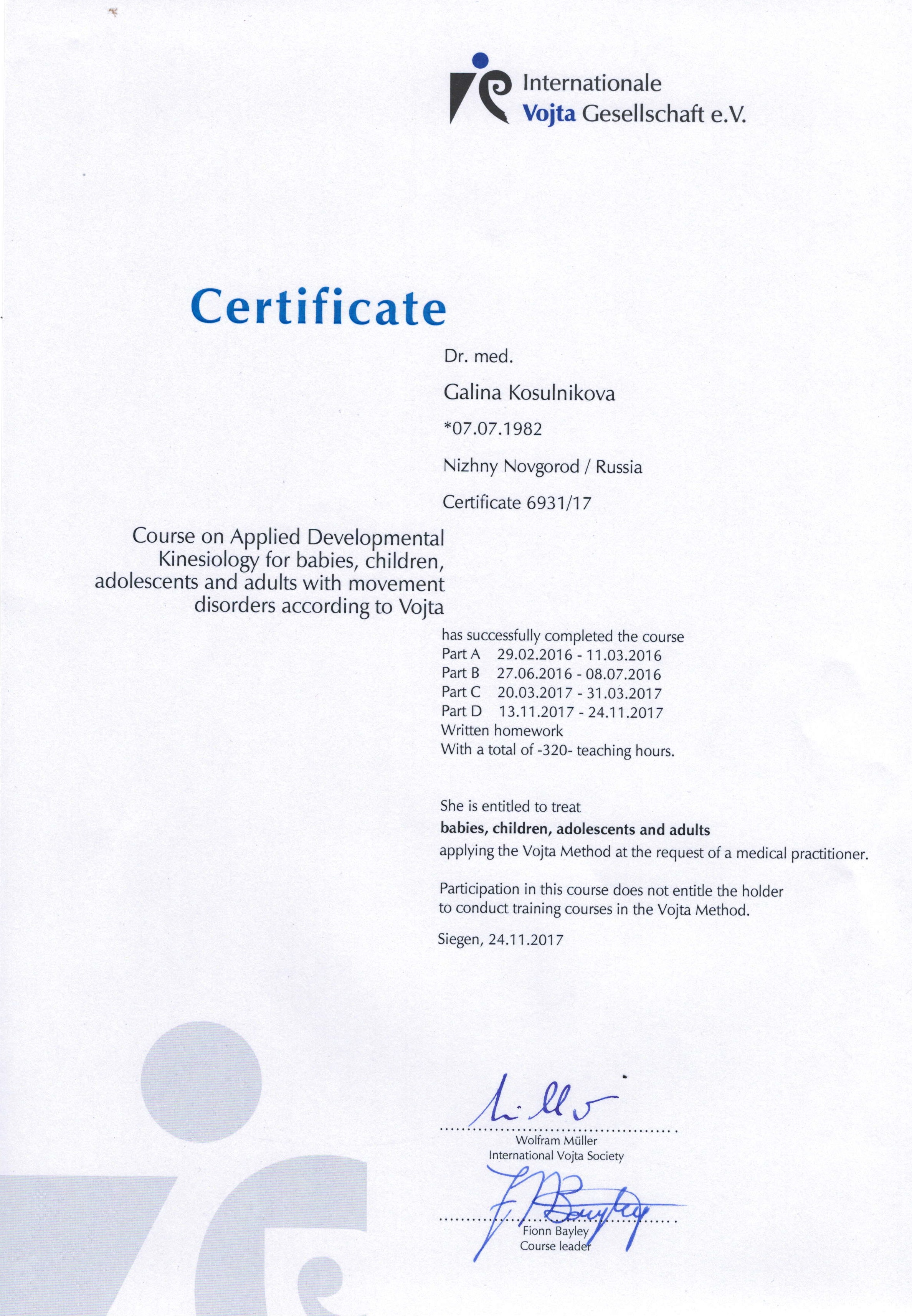 Были изучены современные направления в детской реабилитации Войта-терапии и Войта-диагностики и получен сертификат международного образца